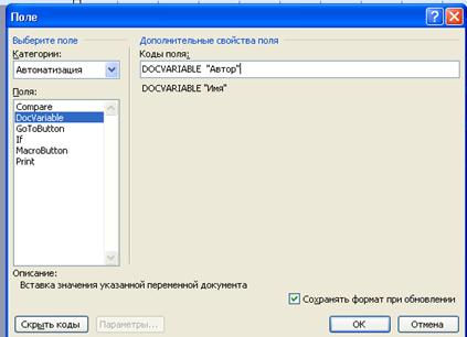 4. В текстовом поле Код поля, после надписи DocVariable, в кавычках введите имя переменной, которую вы хотите отобразить. На рис. 5.6 Author — это имя переменной документа и ее значение будет отображено в документе.