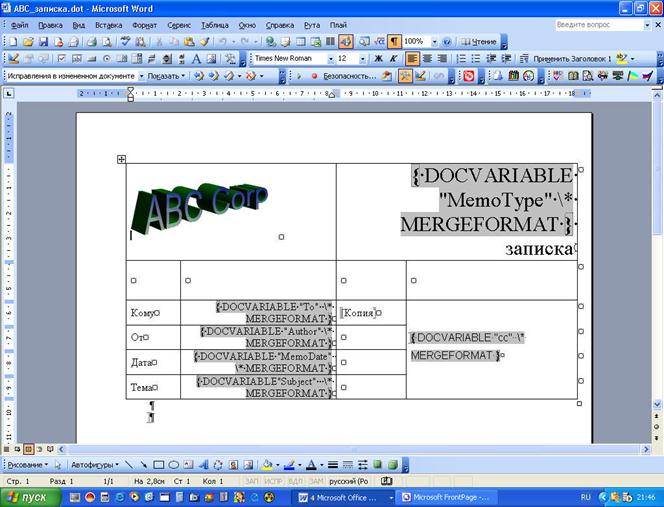 Рисунок 10. 7. Коды полей DocVariable в шаблоне для записок корпорации ABC указывают положение введенной пользователем информации
