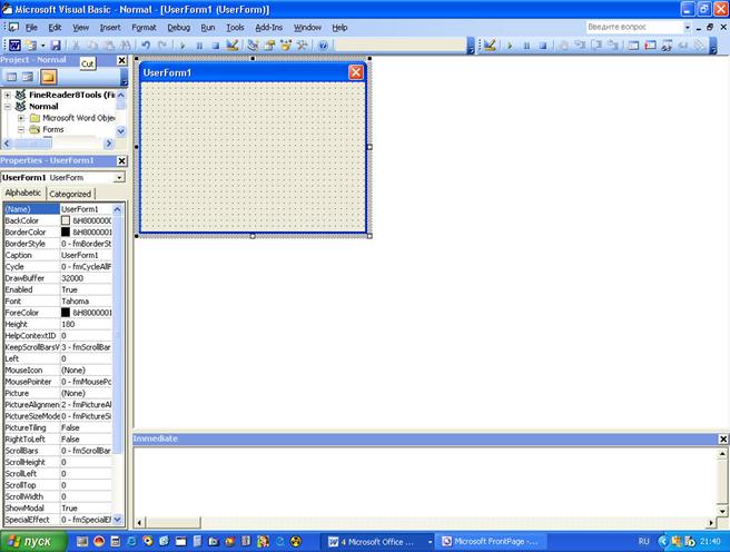 Среда проектирования VBA предлагает вам очень удобный способ разработки инструментов, необходимых для создания собственных диалоговых окон, с помощью которых можно "выудить" у пользователя определенную информацию. Такие диалоговые окна имеют несколько преимуществ и позволяют ввести текст в документ сразу в необходимом формате.