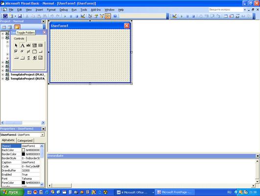 4. Выберите команду Вставка, UserForm. Новая форма будет добавлена в проект и открыта для редактирования.