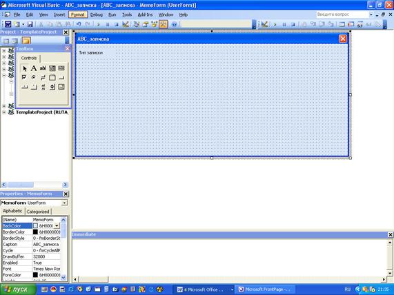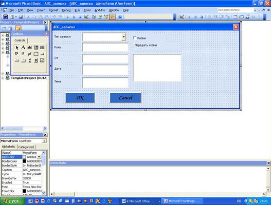 Поскольку новый документ основан на шаблоне АВС_записка, процедура Document_New в данном шаблоне запускается автоматически при создании нового документа. В процессе выполнения процедура Document_New отображает форму MemoForm, заставляя таким образом запускаться процедуру UserForm_Initialize. Подобная цепочка событий весьма типична для программирования в VBA. Макрокоманда NewABCMemo может быть записана в модуле шаблона Обычный или модуле других глобальных шаблонов.