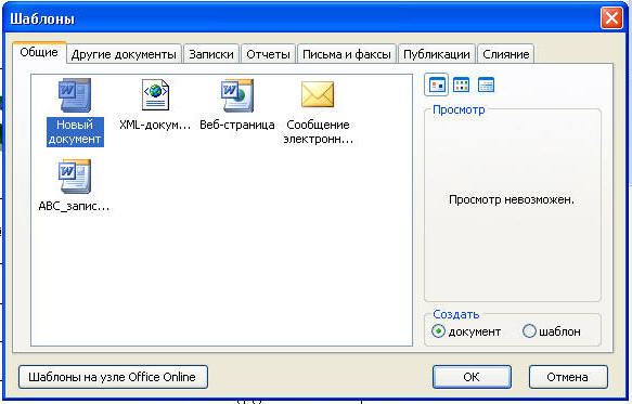 Рис.10.21. Диалоговое окно Создать содержит ярлыки, соответствующие вложенным папкам Шаблоны пользователя и Общие шаблоны