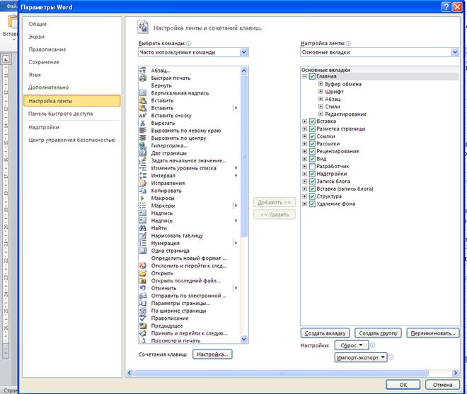 2. Выберите команду Файл, Параметры,Настройка ленты. Появится диалоговое окно Настройка, как показано на рис. 10.22.