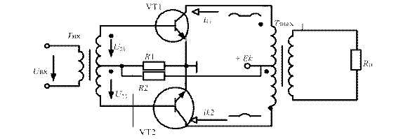 Процесс усиления сигнала происходит в два такта работы схемы: 1/2 волны U вхработает транзистор VT1 затем следующую 1/2 волну U вх работает транзистор VT2. Выходной трансформатор T выхсуммирует сигналы.