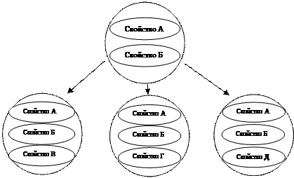 Принцип, положенный в основу такого деления, заключается в том, что каждый подкласс обладает свойствами, присущими тому классу, из которого выделен данный подкласс. Автомобили, грузовики, автобусы и мотоциклы обладают колесами и мотором, являющимися характеристиками наземного транспорта. Кроме тех свойств, которые являются общими у данных класса и подкласса, подкласс может обладать и собственными свойствами: например, автобусы имеют большое число посадочных мест для пассажиров, в то время как грузовики обладают значительным пространством и мощностью для перевозки тяжеловесных грузов и т. д.