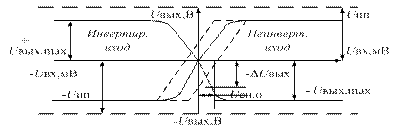 U вх.н – неинвертирующий вход, при подаче на него U вх прираще-ние выходного сигнала совпадает по фазе (знаку) с приращением U вх; U вх.и – инвертирующий вход, для которого приращение U вых в проти-вофазе с приращением U вх. Его используют для ведения отрицатель-ной обратной связи. Важнейшей характеристикой ОУ являются амплитудные (передаточные) характеристики U вых (U вх). Горизантальные участки соотвествуют полностью открытому или закрытому транзистору выходного каскада. Рабочим участком для усилителей является линейный. Состояние, когда U вх= 0 и U вых= 0 называется балансом ОУ. Из-за разброса параметров входного дифференциального каскада возможен разбаланс, когда при U вх = 0 U вых ¹ 0 (штриховая линия). Величина U см.0 – напряжение смещения нуля.