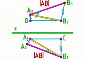 Ортогональная проекция отрезка [AB] прямой на плоскость проекций будет конгруэнтна оригиналу лишь в том случае, когда отрезок параллелен этой плоскости (свойство 6), т.е.
