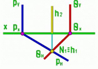 В частном случае, когда плоскости заданы следами и следы пересекаются в поле чертежа, определяют точки пересечения одноименных следов плоскостей. Эти точки общие для двух плоскостей. Они же являются следами линии пересечения заданных плоскостей.