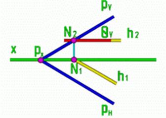 H - Строим фронтальную проекцию (M2) горизонтального следа (M1) и горизонтальную проекцию (N1) фронтального следа (N2).