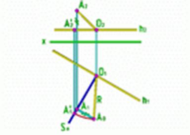 Центр вращения O, как уже отмечено, находится в точке пересечения h с плоскостью S. Чтобы определить величину радиуса вращения |OA|, необходимо построить в плоскости Н прямоугольный треугольник