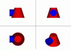 Пример 2. Дано: Прямой круговой усечённый конус, расположенный вертикально (на H) и цилиндр, расположенный горизонтально (на W). Оси цилиндра и конуса пересекаются в точке O.