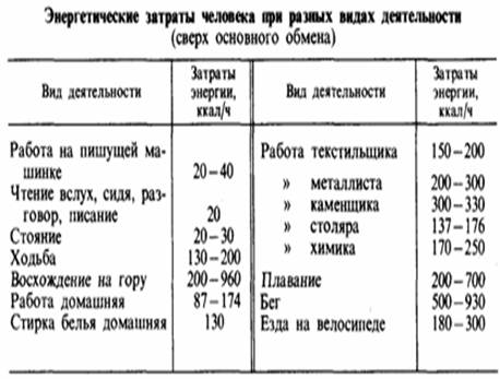 Таблица 3- Затраты энергии человека при разных видах деятельности