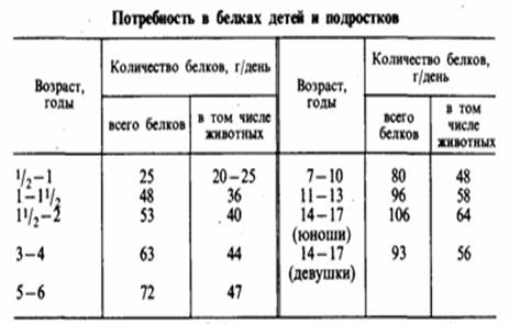 Соответствующие нормативы для детей и подростков характеризуются меньшими абсолютными величинами и большими относительными показателями, т. е. количеством белка, приходящегося на 1 кг массы тела, которое является особенно значительным для маленького ребенка (табл. 5). Последнее также относится к содержанию в детском рационе животных белков.
