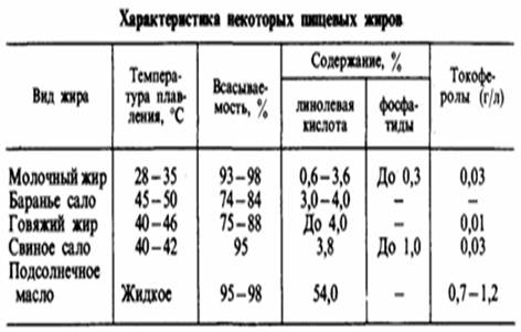 Подразделение жиров по их происхождению на полноценные (животные) и неполноценные (растительные), применяемое до недавнего времени, не имеет под собой каких-либо объективных обоснований. Как энергетические вещества они не обладают существенными различиями. В отношении же усвояемости растительные масла характеризуются даже лучшими показателями, чем некоторые тугоплавкие животные жиры, что связано с трудностью эмульгирования последних. Наконец, по своему качественному составу ни один из используемых в питании человека натуральных жировых продуктов не является биологически полноценным во всех отношениях.
