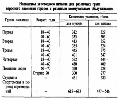 Таблица 9 – Нормативы углеводного питания взрослого человека