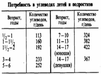 Потребность в углеводах в первую очередь определяется величиной энергетических затрат, причем в современных условиях соответствующие нормативы для лиц, не занимающихся физическим трудом, должны быть значительно снижены, особенно в зрелом и пожилом возрасте (табл. 9). Что касается норм углеводного питания для детей и подростков, то при их становлении опять-таки необходимо исходить из возрастных особенностей организма, определяющих его энергетические потребности (табл. 10).