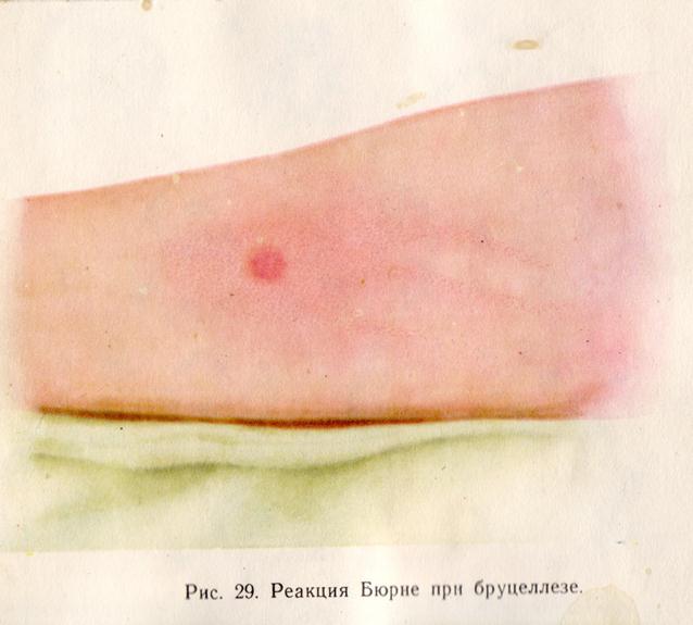 В.Если больному бруцеллезом ввести внутрикожно (сгибательная поверхность предплечья) 0,1 мл. бруцеллина (убитые бруцеллы), то через 6-8 часов на месте введения развивается отек, покраснение – реакция Бюрне.