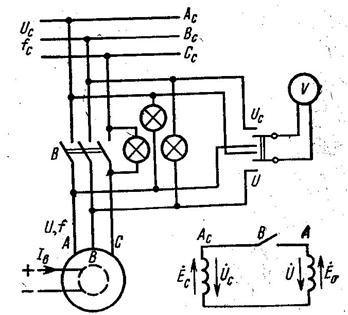 Для проверки выполнения условий включения генератора применяют приборы – синхроноскопы. Простейший ламповый состоит из трех ламп, включенных как показано на рис. Равенство U с и UГ контролируется вольтметром. Если U с и UГ не равны, то изменяют ток возбуждения СГ. Каждая лампа синхроноскопа включена так, что к ней приложено напряжение UГ - Uс. Если выполнены все условия параллельной работы, то все Δ = 0 и лампы не горят. В этот момент можно включать выключатель. На электростанциях для синхронизации мощных генераторов используют стрелочные синхроноскопы.
