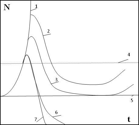 1- всплеск мощности без средств защиты (по еxp закону), мощность быстро нарастает вплоть до разрушения реактора.