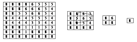 Это было использование когерентности в объектном пространстве, можно использовать и когерентность в картинной плоскости, то, что для соседних пикселов значение глубины отличается несильно. Для этого применяют иерархический Z-буфер. Кроме основного массива, создают его уменьшенный вариант, объединяя четверки соседних пикселей 2х2 в один. Значение глубины для уменьшенного Z-буфера выбирается максимальная. Таким образом формируется набор все меньших Z-буферов вплоть до массива с одним элементом, глубина в нем будет соответствовать максимальной глубине в сцене. Получается своего рода пирамида Z-буферов.
