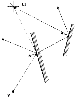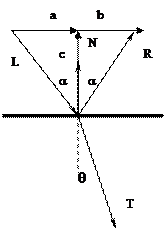 При переходе границы двух сред происходит отражение и преломление света. Угол отражения a равен углу падения. Отсюда легко можно получить отраженный вектор.