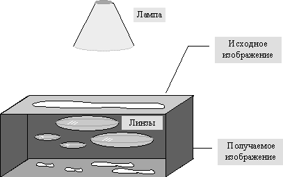 Наиболее наглядно этот процесс можно представить как Фотокопировальную Машину, состоящую из экрана, на котором изображена исходная картинка, и системы линз, проецирующих изображение на другой экран:
