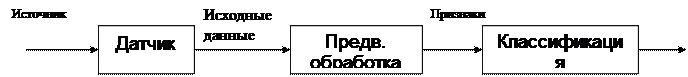 Например, при распознавании текста, вначале текст сканируется (исходные данные), затем изображение сегментируется на 2 уровня яркости, разделяется на отдельные абзацы, строки символов и отдельные символы (получаем признаки символа в виде изображения отдельного символа или его контура/скелета), потом по этим признакам определяются сами символы. В качестве признаков могут использоваться как значения яркости пикселей (1 или 2 классы), так и параметры контуров и остовов (3 или 4 класс). В пером случае – значение яркости пикселов сразу подают на S-элементы персептрона (символ при этом необходимо предварительно отмасштабировать).