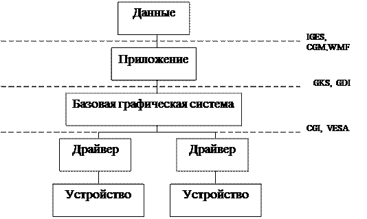Более гибкое и мощное использование иерархического принципа заключается в разбиении средств вывода графпакета на три логических уровня с четкой фиксацией уровней и соблюдением интерфейсов между ними. Каждый уровень является для последующего некоторым виртуальным графическим устройством. Такой подход позволяет безболезненно модифицировать (улучшать) отдельные уровни, легко распределять программное обеспечение между различными ЭВМ, стыковать графическую систему с другими компонентами программного обеспечения.