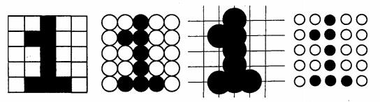 Форма пикселов растра определяется особенностями устройства графического вывода (рис. 2). Например, пикселы могут иметь форму прямоугольника или квадрата, которые по размерам равны шагу растра (дисплей на жидких кристаллах); пикселы круглой формы, которые по размерам могут и не равняться шагу растра (принтеры).