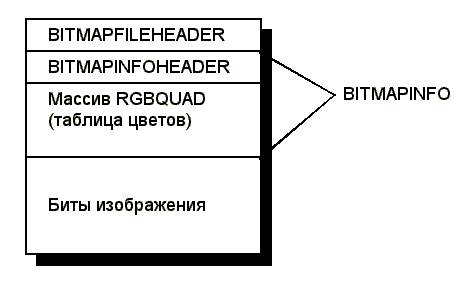 Файл, содержащий битовое изображение, начинается со структуры BITMAPFILEHEADER. Эта структура описывает тип файла и его размер, а также смещение области битов изображения.
