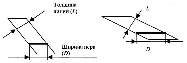 Для вывода толстых линий с помощью пера в качестве отрезка линии чаще всего используются отрезки горизонтальной или вертикальной линий, реже – диагональные отрезки под углом 45 градусов. Целесообразность использования такого способа определяется большой скоростью вывода горизонтальных и вертикальных отрезков прямой. Для того чтобы достигнуть минимального количества тактов вывода, толстые линии, которые по наклону ближе к вертикальным, рисуют горизонтальным пером, а пологие линии – вертикальным пером.