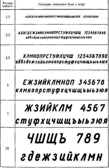 Размер шрифта определяется высотой h прописных (заглавных) букв в миллиметрах. Устанавливаются следующие размеры шрифта: 1,5; 2,5; 3,5; 5; 7; 10; 14; 20; 28; 40.