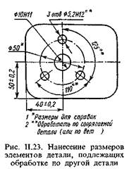 3) размеры, определяющие положение элементов детали, подлежащих обработке по другой детали (рис. 11.23);