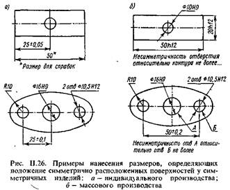 Размеры, определяющие положение симметрично расположенных поверхностей у симметричных изделий, наносят, как показано на рис. 11.26.