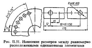 При нанесении размеров между равномерно расположенными одинаковыми элементами изделия рекомендуется наносить размер между соседними элементами и размер между крайними элементами в виде произведения количества промежутков между элементами на размер промежутка (рис. 11.51).