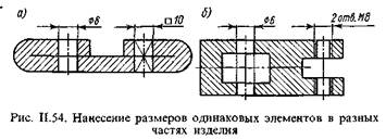 Одинаковые элементы, расположенные в разных частях изделия (например, отверстия), рассматриваются как один элемент, если между ними нет промежутка (рис. 11.54, и) или если эти элементы соединены тонкими сплошными линиями (рис. 11.54, б, слева). При отсутствии этих условий указывают полное количество элементов (рис. 11.54, б, справа).