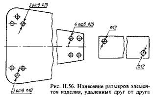 Допускается повторять размеры одинаковых элементов, лежащих на одной поверхности, когда они значительно удалены друг от друга и не увязаны между собой размерами (рис. 11.56).