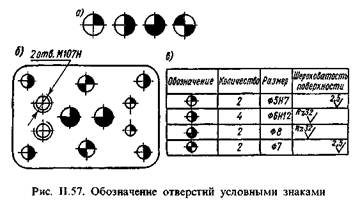 Когда на чертеже показано несколько групп отверстий, мало отличающихся по размерам, то рекомендуется отмечать одинаковые отверстия одним из условных знаков (рис. 11.57, а). Количество отверстий и их размеры допускается указывать в таблице (рис. 11.57, в).