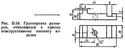 Размеры, относящиеся к одному и тому же конструктивному элементу (пазу, выступу, отверстию, фаске), рекомендуется группировать в одном месте, располагая их на том изображении, на котором геометрическая форма элемента показана наиболее полно (рис. 11.60).