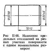 На поверхности с одним номинальным размером, имеющей участки с разными предельными отклонениями, границу между участками проводят сплошной тонкой линией, а номинальный размер с соответствующими предельными отклонениями наносят для каждого участка отдельно (рис. 11.68).