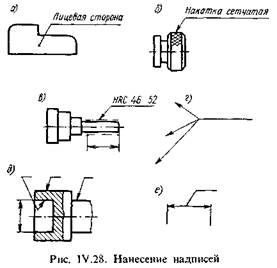 В надписях на чертежах не должно быть сокращений слов, за исключением общепринятых, а также установленных в стандартах. Текст на поле чертежа, таблицы, надписи с обозначением изображений располагают параллельно основной надписи чертежа (рис. IV.28). Около изображений на полках линий – выносок наносят только краткие надписи, относящиеся непосредственно к изображению предмета, например указания о количестве конструкционных элементов (отверстий, канавок и т. п.), если они не внесены в таблицу.