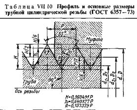 Профиль и основные размеры трубной цилиндрической резьбы приведены в табл. VII. 10. Вершину профиля резьбы допускается выполнять с плоским срезом в пределах, ограниченных соответственно допусками наружного диаметра резьбы трубы и внутреннего диаметра резьбы муфты. Для трубной цилиндрической резьбы установлены два класса точности: А и В (ГОСТ 6357 – 73).