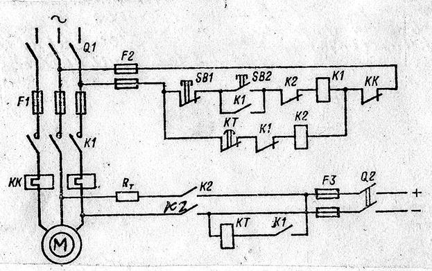 При пуске АД включаются рубильники Q 1 и Q 2. Нажатием на кнопку SB 2 подают напряжение на катушку магнитного пускателя К 1, протекает ток. Замыкаются главные контакты К 1 в цепи статора. Двигатель запускается. Одновременно с замыканием главных контактов пускателя н. о. контакт К 1 блокирует кнопку SB 2, и замыкается н. о. контакт К 1 в цепи катушки контактора К2. Ток в цепи контактора К 2 отсутствует, пока двигатель работает. В цепи катушки реле времени КТ замыкается контакт К 1, который обеспечивает подготовку реле времени КТ к работе.