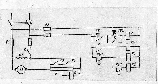 При замыкании рубильника Q тока в главной цепи нет и двигатель в ход не идет. В цепи управления ток через замкнутые контакты К протекает по катушке реле ускорения KV 1 и контакты его размыкаются. При нажатии на пусковую кнопку SB 2 ток проходит через катушку контактора К, что приводит к замыканию контактов К в главной цепи и двигатель идет в ход. (пусковой ток якоря ограничен двумя ступенями пускового реостата R). Одновременно в цепи управления замыкаются контакты К, блокирующие пусковую кнопку SB 2, и размыкаются контакты KV 1. Это приводит к тому, что через установленную выдержку времени t 1 контакты KV 1замыкаются, ток проходит через катушку ускорения К 1 и в результате замыкания контактов К 1 одна ступень пускового сопротивления шунтируется. Одновременно шунтируется катушка реле KV 2, что приводит через время t 2 к замыканию контактов KV 2(эти контакты были открыты под воздействием напряжения на катушке KV 2). Ток проходит через катушку контактора ускорения К 2, контакты К 2 замыкаются, что приводит к шунтированию второй ступени пускового реостата. Двигатель работает в нормальном режиме, т. е. без дополнительного сопротивления в цепи якоря. Остановка двигателя производится нажатием на кнопку SB 1 и вся схема приходит в предпусковое состояние.