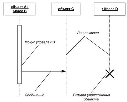 Крайним слева на диаграмме изображается объект, который является инициатором взаимодействия (объект а на рис. 43). Правее изображается другой объект, который непосредственно взаимодействует с первым. Таким образом, порядок расположения объектов на диаграмме последовательности определяется исключительно соображениями удобства визуализации их взаимодействия друг с другом.