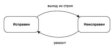 Простейшим примером визуального представления состояний и переходов на основе формализма автоматов может служить ситуация с исправностью технического устройства, такого как компьютер. В этом случае вводятся в рассмотрение два самых общих состояния: «исправен» и «неисправен» и два перехода: «выход из строя» и «ремонт». Графически эта информация может быть представлена в виде изображенной ниже диаграммы состояний компьютера (рис.48).
