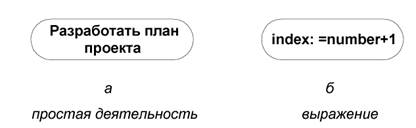 Графически состояние действия изображается фигурой, напоминающей прямоугольник, боковые стороны которого заменены выпуклыми дугами (рис.52). Внутри этой фигуры записывается выражение действия (action-expression), которое должно быть уникальным в пределах одной диаграммы деятельности.
