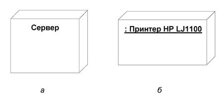 Графически на диаграмме развертывания узел изображается в форме трехмерного куба (строго говоря, псевдотрехмерного прямоугольного параллелепипеда). Узел имеет собственное имя, которое указывается внутри этого графического символа. Сами узлы могут представляться как в качестве типов (рис. 61, а), так и в качестве экземпляров (рис. 61, б).