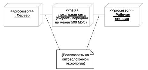 Соединения являются разновидностью ассоциации и изображаются отрезками линий без стрелок. Наличие такой линии указывает на необходимость организации физического канала для обмена информацией между соответствующими узлами. Характер соединения может быть дополнительно специфицирован примечанием, помеченным значением или ограничением. Так, на представленном ниже фрагменте диаграммы развертывания (рис. 62) явно определены не только требования к скорости передачи данных в локальной сети с помощью помеченного значения, но и рекомендации по технологии физической реализации соединений в форме примечания.
