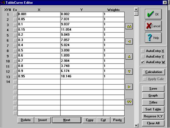 Далее в ниспадающем меню нужно активизировать пункт TableCurve Editor…. На экране появится окно редактора в виде электронной таблицы, в которую можно занести 1500-2000 эмпирических точек.